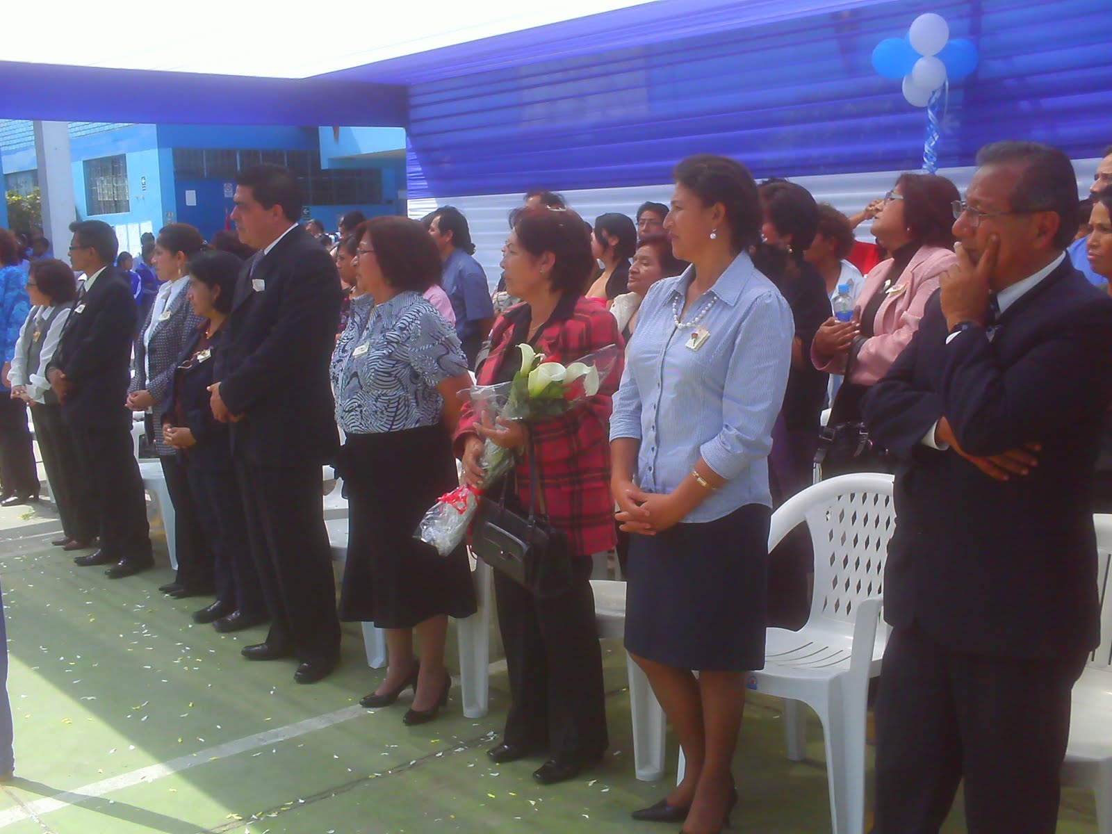 Me permito dar especial mención a Juan Carlos Bates Lévano profesor de Educación por el Arte con casi 30 años de servicios en esta IE y que participó allá en 1982 cuando celebrada el colegio sus Bodas de Plata, en la creación del himno lourdesino. Igualmente a la Profesora Dolly Príncipe Bardales por su talento y promoción de la música folclórica peruana latino americana que rescata y resalta así nuestra identidad milenaria y de país pluricultural,. Así mismo a las profesoras Noemí Suarez, Delia Palacios, Ruth Alvarez por haber participado entonando el himno lourdesino para la grabación correspondiente, al maestro Hector Almora Castillo ejemplo y modelo a seguir., (aplausos). De igual manera al Auxiliar de Educación Juan Obregón por su puntualidad y amor a su trabajo, a la Srta Leonor Gamero Oficinista II por su compromiso y entrega total a su labor. A las alumnas de la Banda dirigidas por el Prof. Carlos Alí Pérez y también a las chicas de la Escolta, que en las diferentes presentaciones dentro y fuera del distrito han hecho quedar en alto a nuestra IE. Podría seguir citando docentes de gran trayectoria y amor a su trabajo, pero si de alguien me olvido en esta oportunidad, por favor, colegas de ayer y hoy, mil disculpas.
